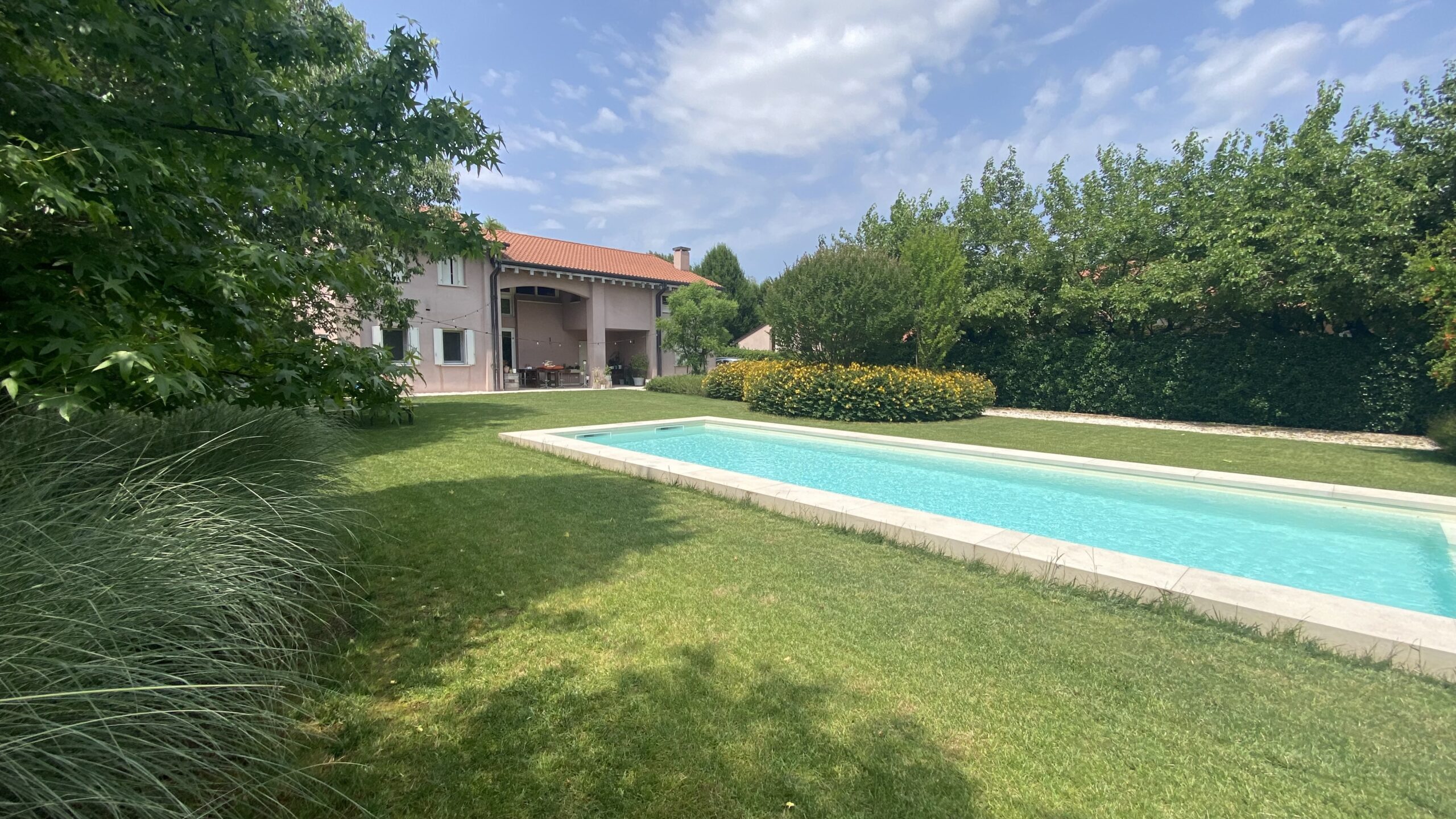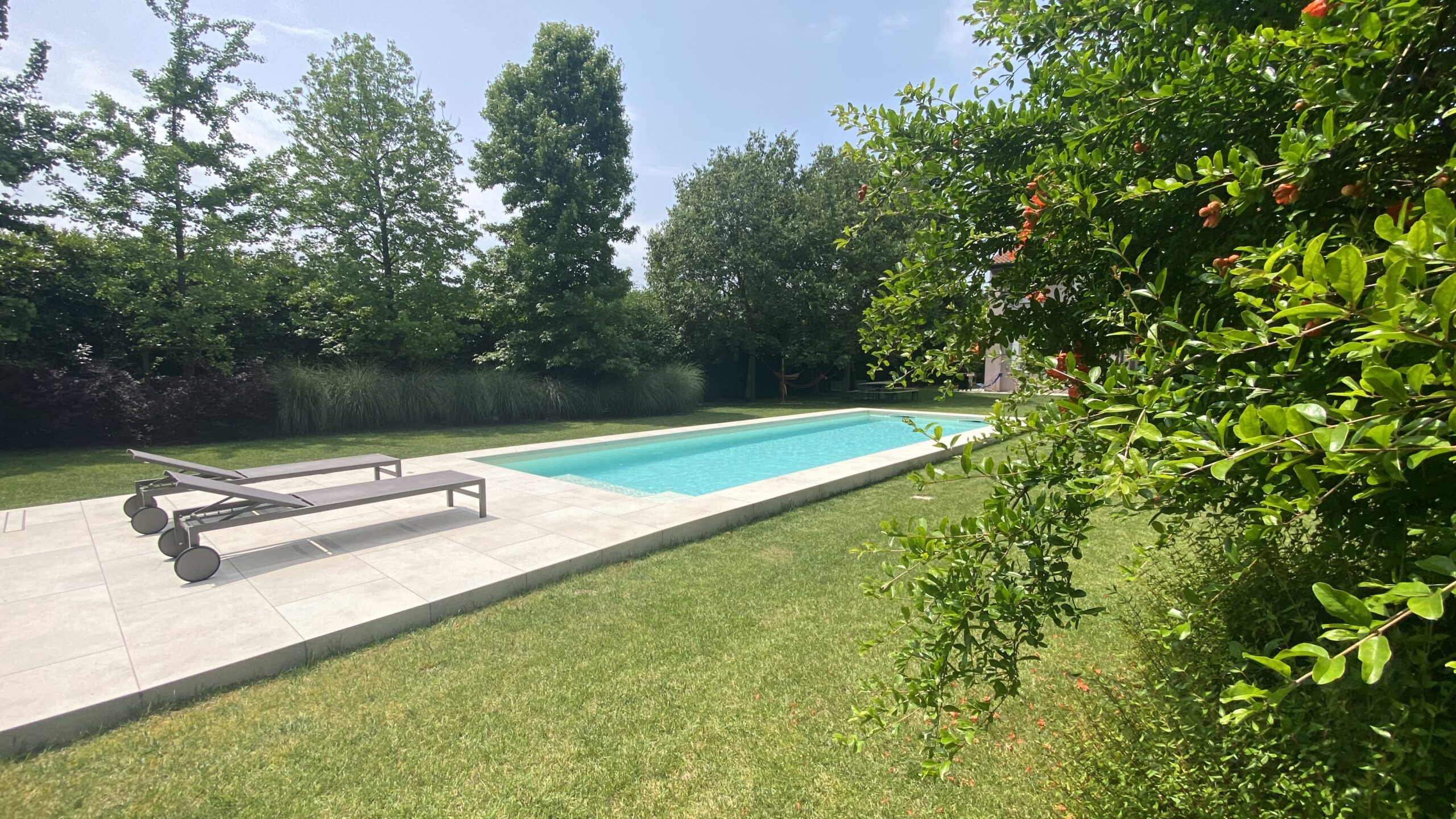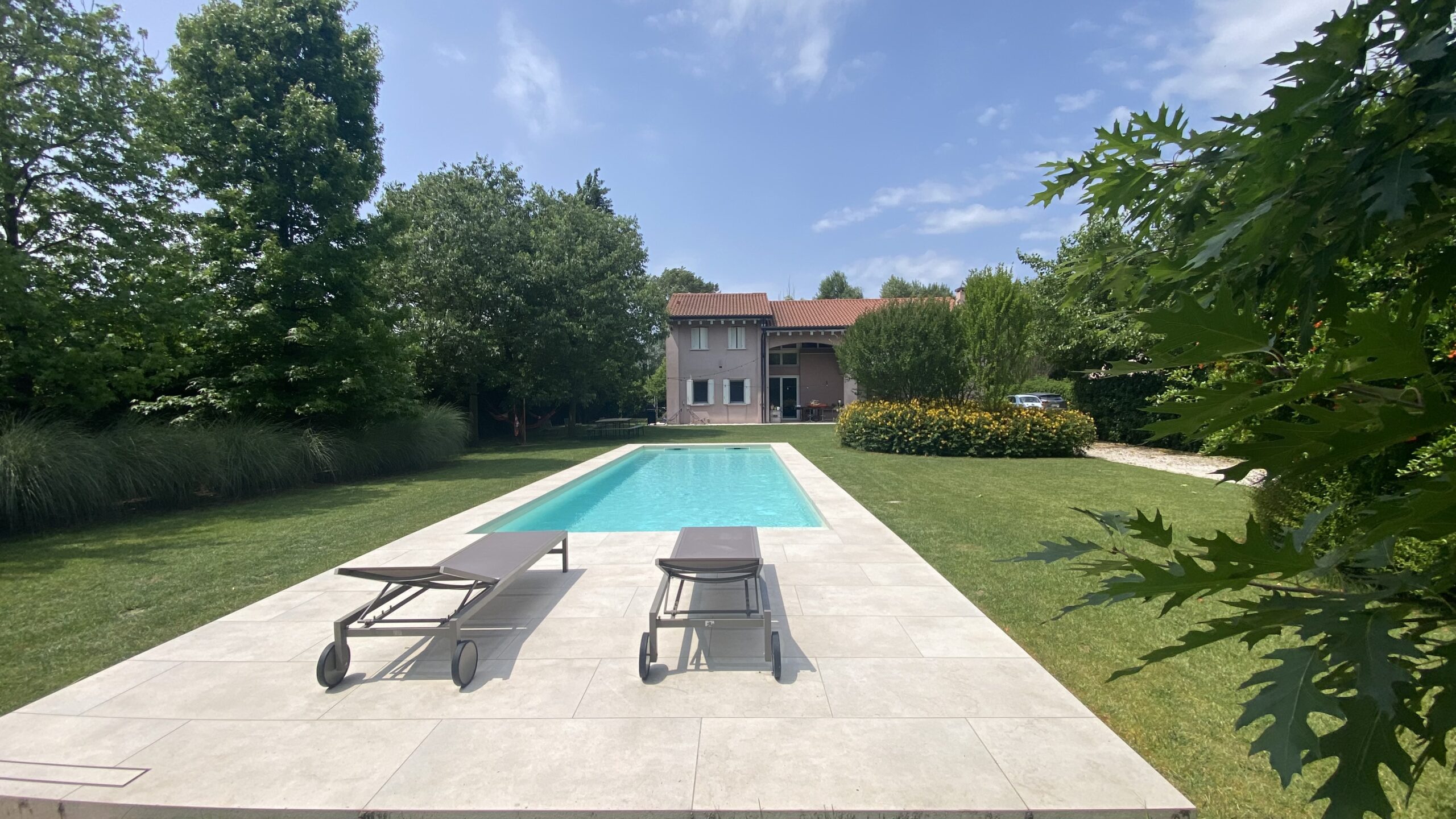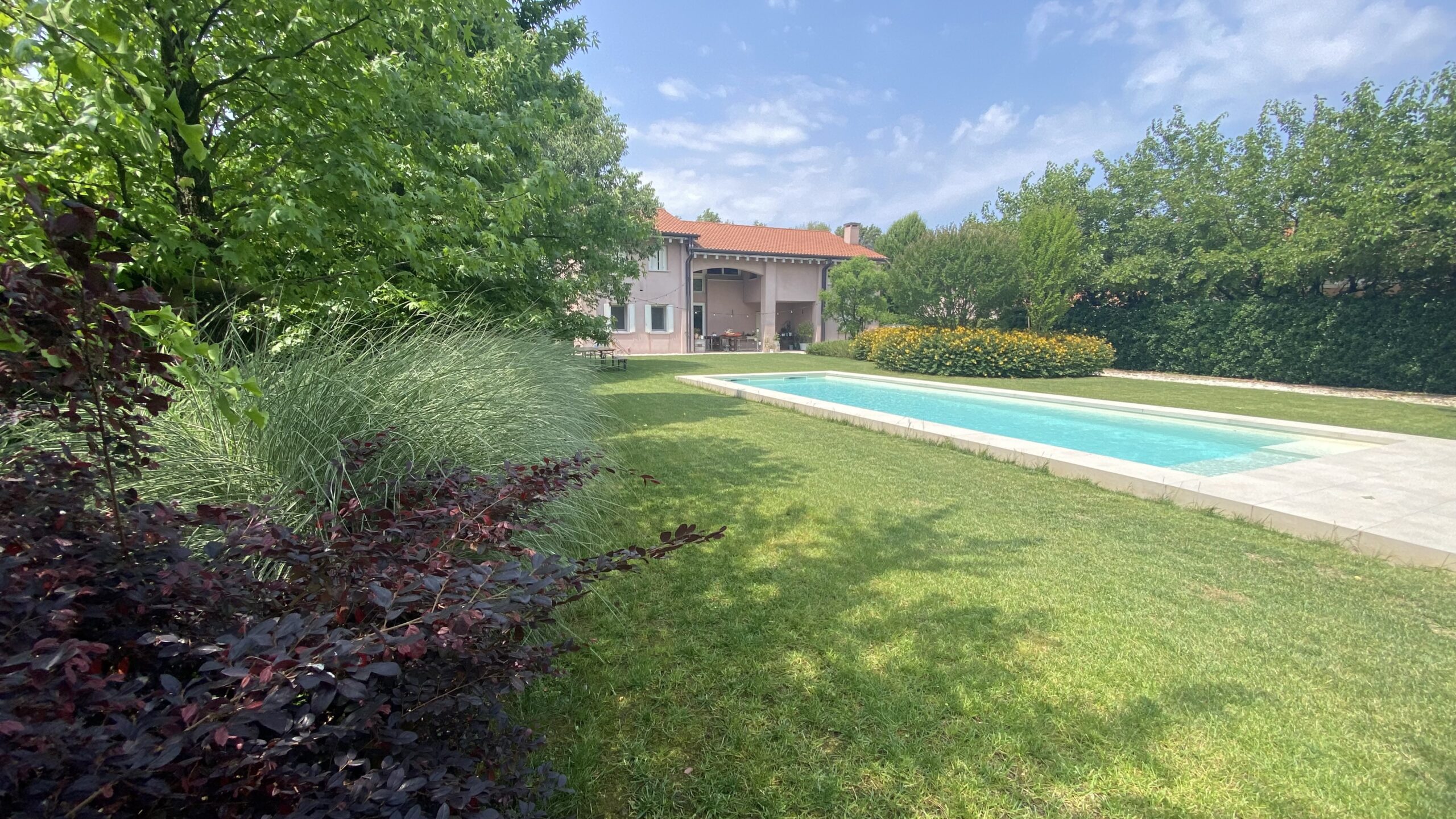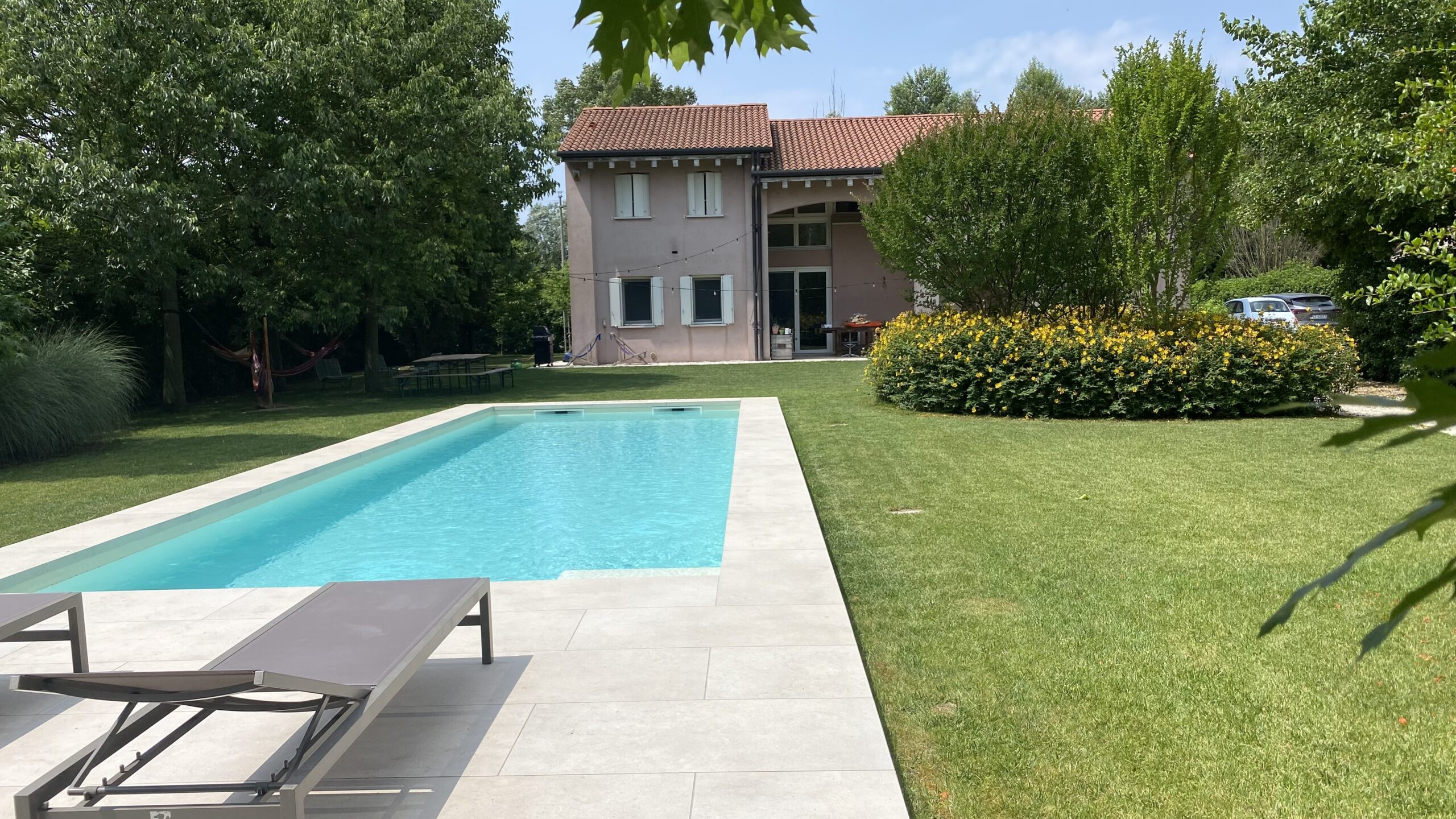 Il progetto ha ridefinito la percezione e il rapporto con l’esterno di un rustico immerso nella campagna veneta in cui l’inserimento di una piscina interrata e una ridistribuzione spaziale della viabilità e del verde hanno elevato il luogo da anonimo a luogo con un proprio carattere, nel rispetto del contesto. La piscina è stata volutamente posizionata al centro e leggermente rialzata sia per ragioni di dominio sul resto sia per ragioni pratiche di distanza dagli alberi esistenti e dai loro coni d’ombra. Dopo aver operato alcuni spostamenti di esemplari nel modo più funzionale al nuovo progetto è stata creato un fondale perimetrale di forma sinuosa in modo da non percepire la regolarità del lotto ed enfatizzare la sensazione “immersiva” nella natura. L’obbiettivo è stato quello di veicolare le viste proprio con l’utilizzo delle nuove masse arbustive, talvolta occultando talvolta aprendo, ottenendo un’ambientazione semplice e intuitiva in cui il concetto di armonia non dev’essere spiegato ma “sentito”. Particolare attenzione è stata messa nell’accostamento cromatico stagionale (fioriture, foliage, cortecce) e nell’utilizzo di arbusti con fogliame e texture in alternanza. Un approccio olistico è sempre garanzia di un benessere completo per i luoghi dell’abitare.