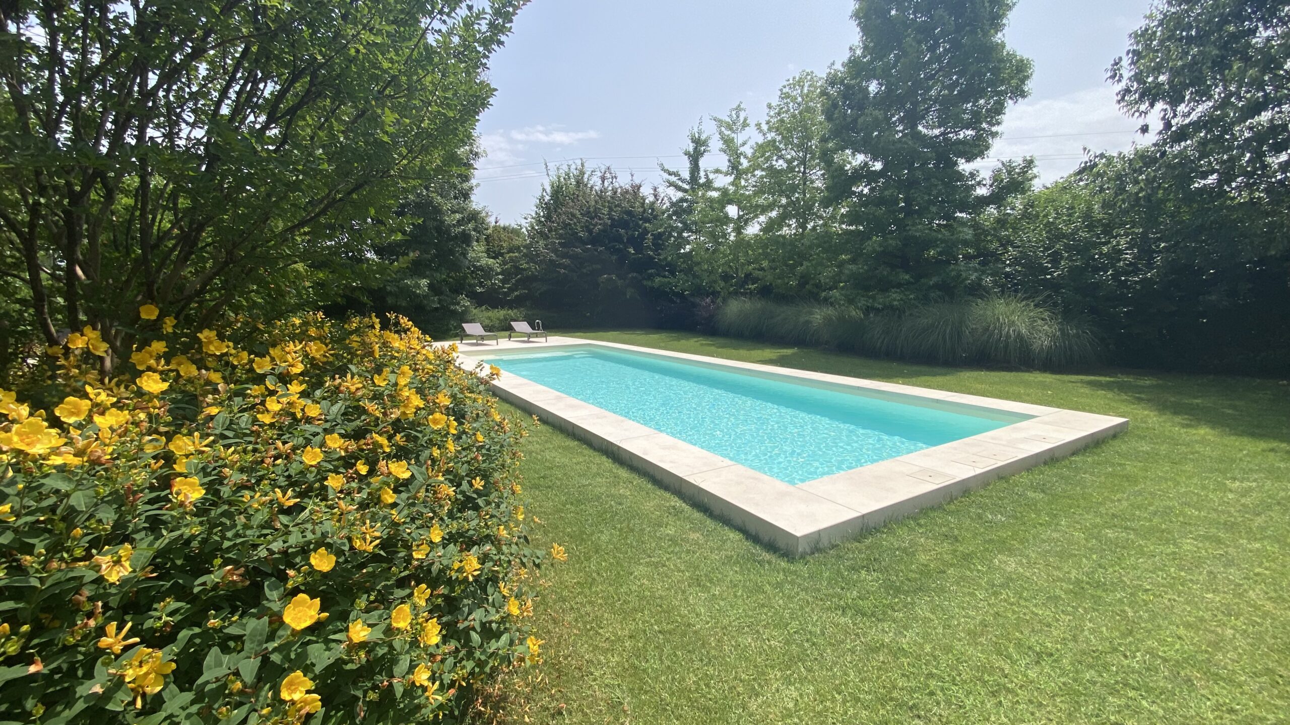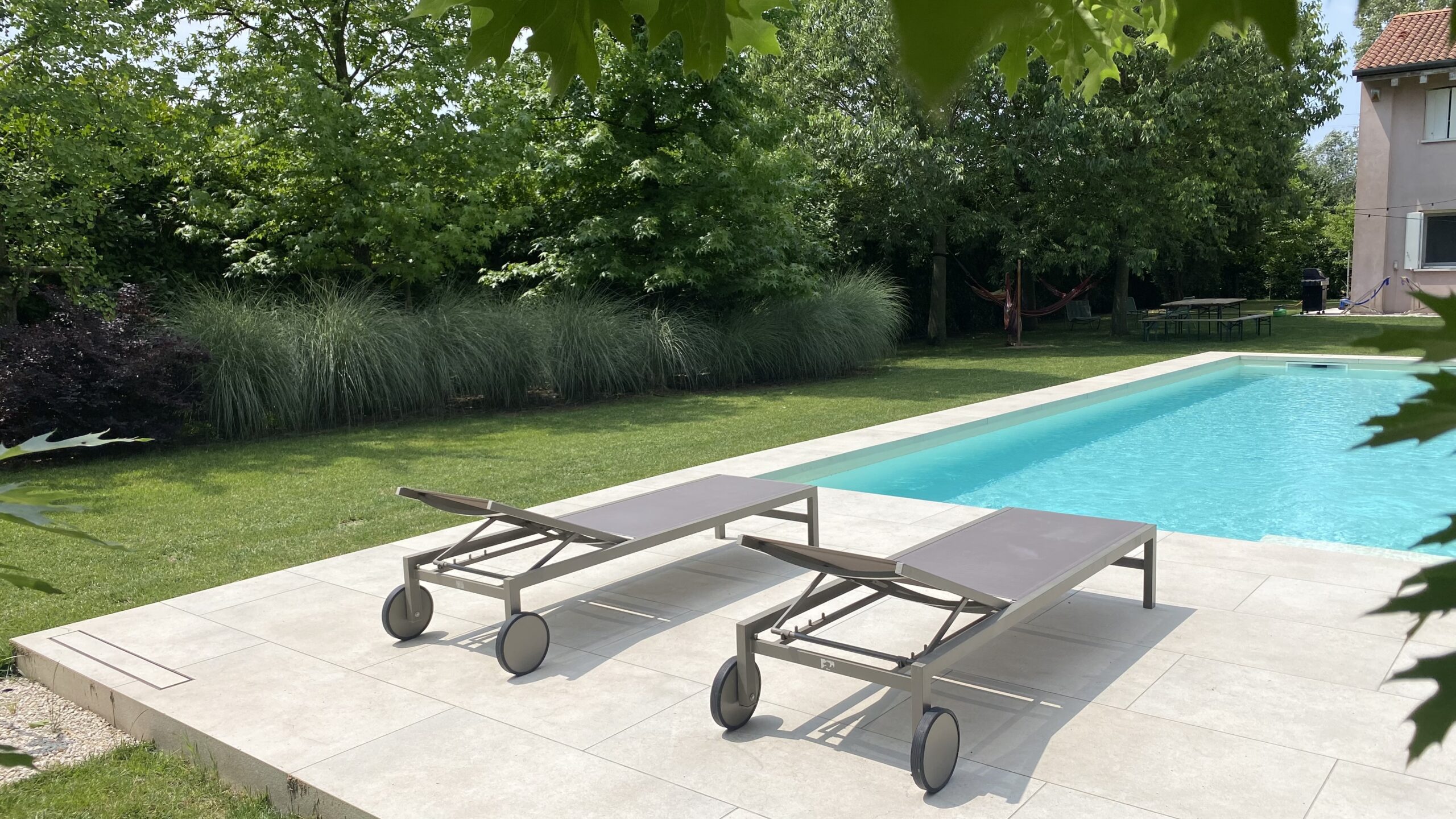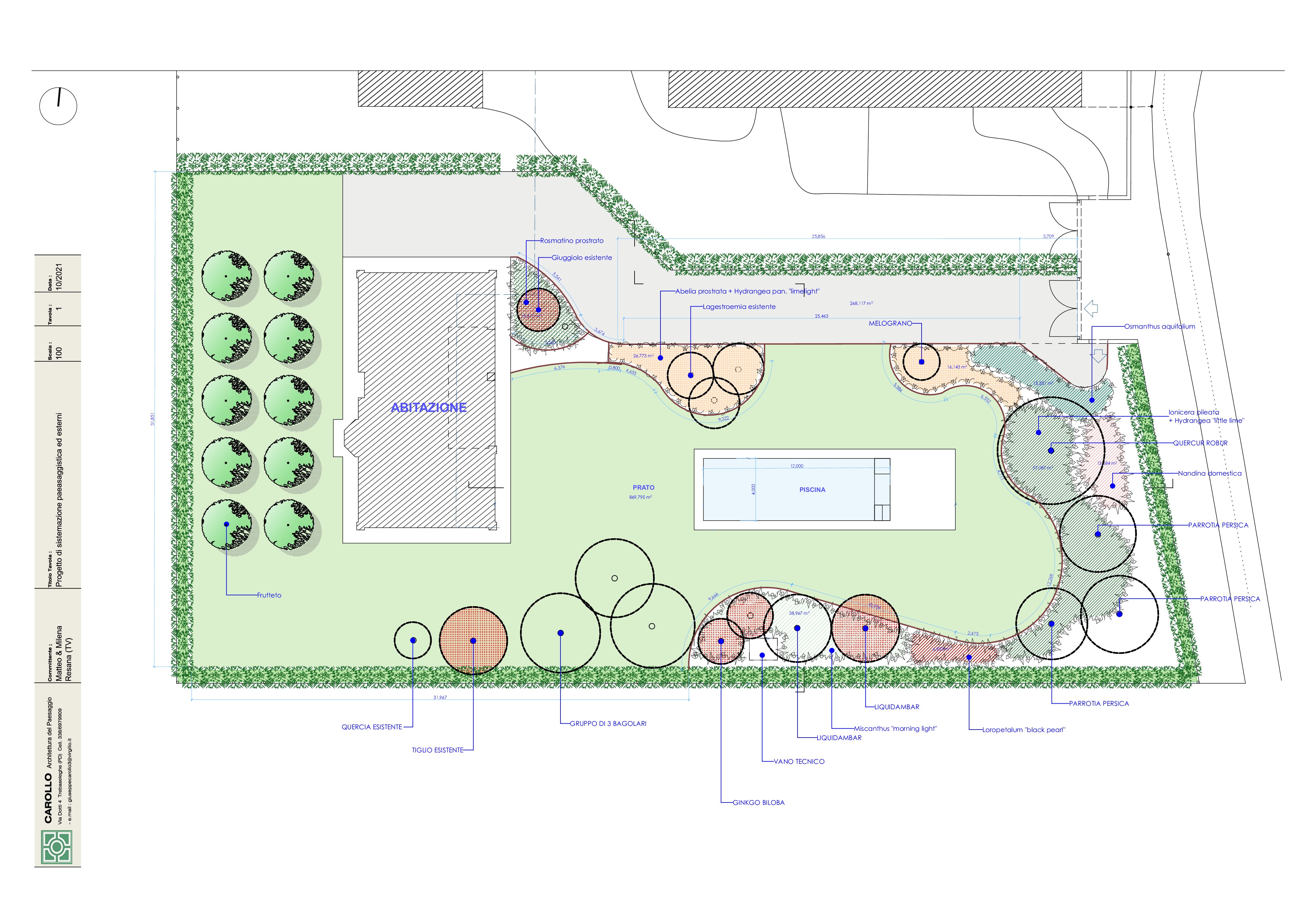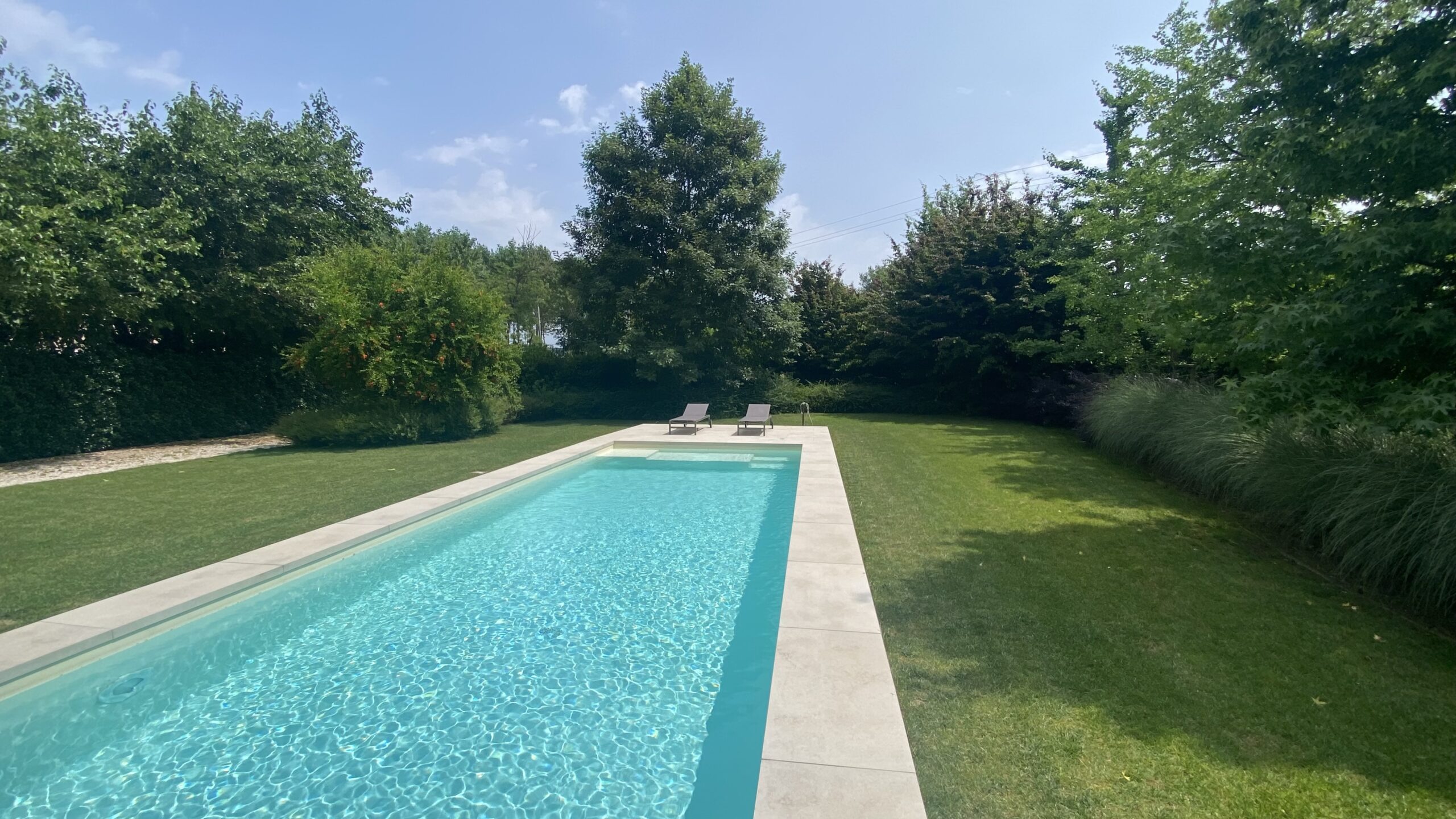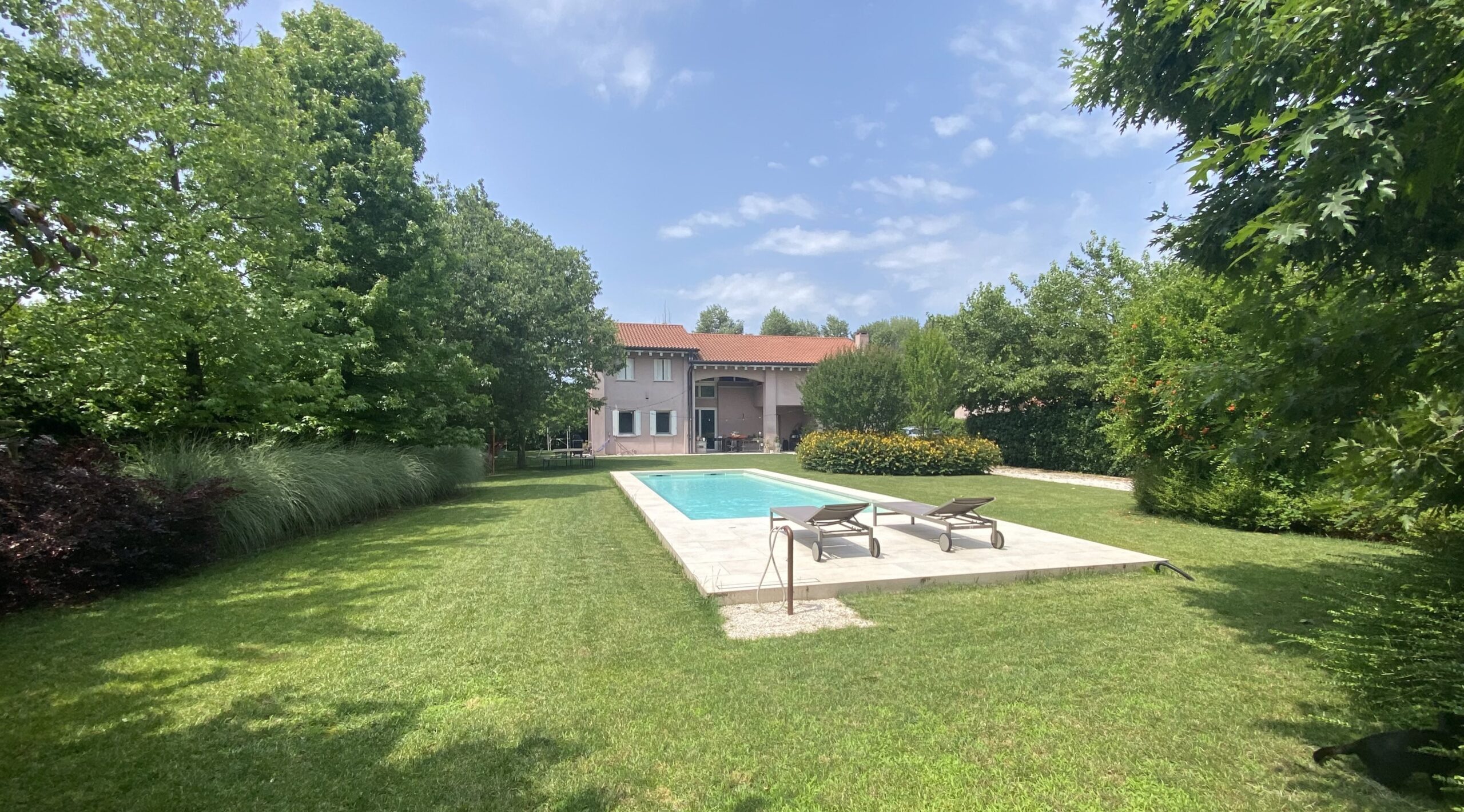 Il progetto ha ridefinito la percezione e il rapporto con l’esterno di un rustico immerso nella campagna veneta in cui l’inserimento di una piscina interrata e una ridistribuzione spaziale della viabilità e del verde hanno elevato il luogo da anonimo a luogo con un proprio carattere, nel rispetto del contesto. La piscina è stata volutamente posizionata al centro e leggermente rialzata sia per ragioni di dominio sul resto sia per ragioni pratiche di distanza dagli alberi esistenti e dai loro coni d’ombra. Dopo aver operato alcuni spostamenti di esemplari nel modo più funzionale al nuovo progetto è stata creato un fondale perimetrale di forma sinuosa in modo da non percepire la regolarità del lotto ed enfatizzare la sensazione “immersiva” nella natura. L’obbiettivo è stato quello di veicolare le viste proprio con l’utilizzo delle nuove masse arbustive, talvolta occultando talvolta aprendo, ottenendo un’ambientazione semplice e intuitiva in cui il concetto di armonia non dev’essere spiegato ma “sentito”. Particolare attenzione è stata messa nell’accostamento cromatico stagionale (fioriture, foliage, cortecce) e nell’utilizzo di arbusti con fogliame e texture in alternanza. Un approccio olistico è sempre garanzia di un benessere completo per i luoghi dell’abitare.