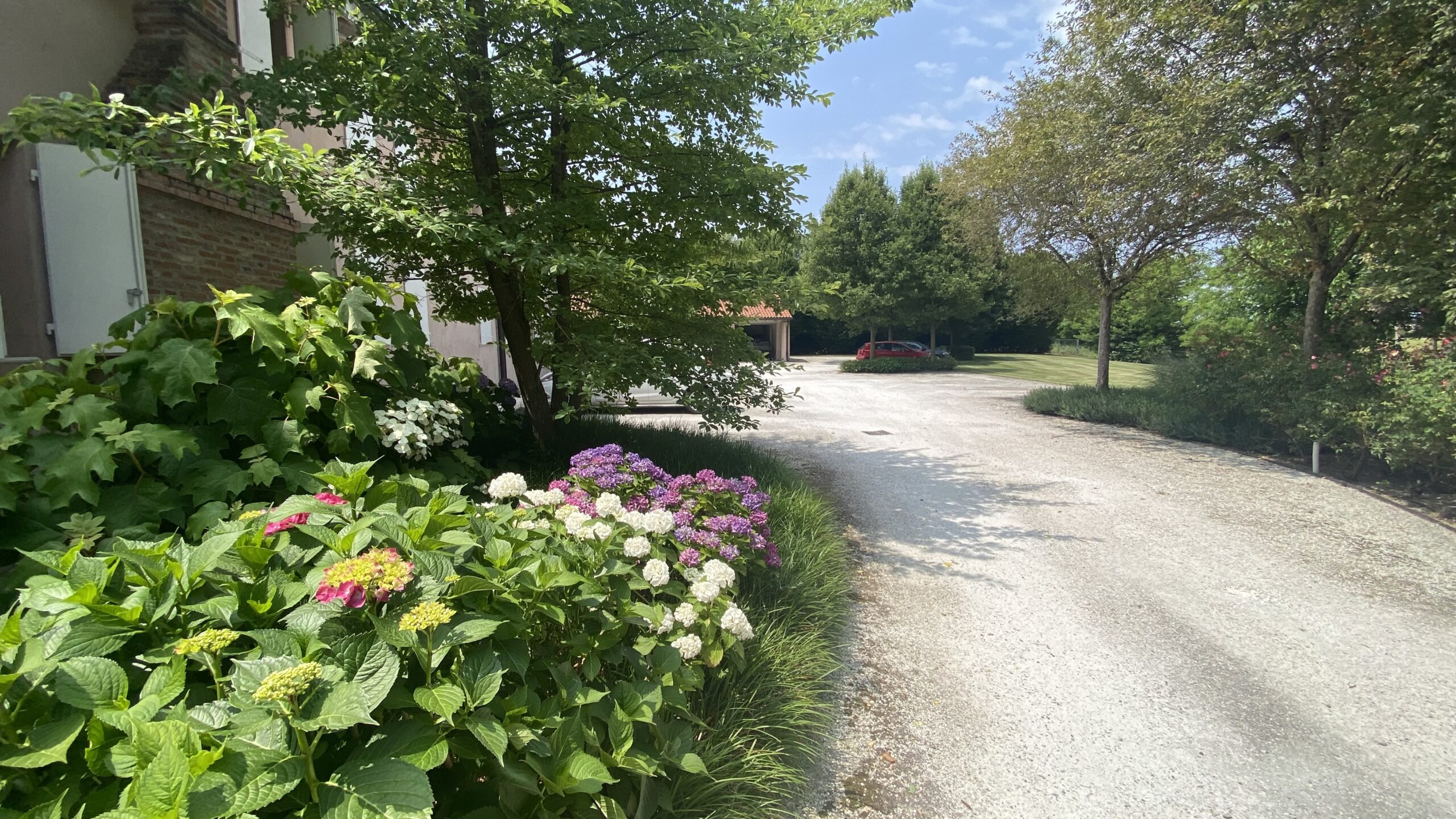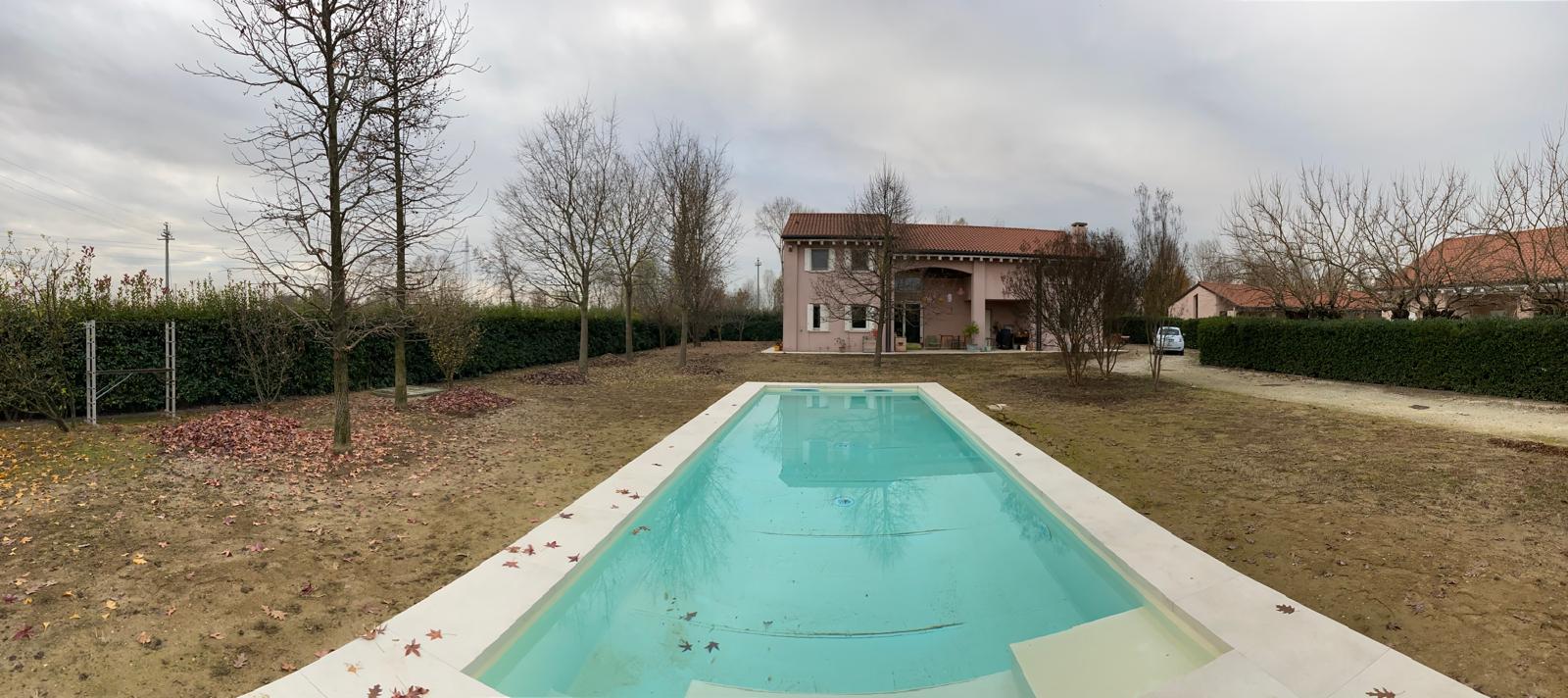 Il progetto ha ridefinito la percezione e il rapporto con l’esterno di un rustico immerso nella campagna veneta in cui l’inserimento di una piscina interrata e una ridistribuzione spaziale della viabilità e del verde hanno elevato il luogo da anonimo a luogo con un proprio carattere, nel rispetto del contesto. La piscina è stata volutamente posizionata al centro e leggermente rialzata sia per ragioni di dominio sul resto sia per ragioni pratiche di distanza dagli alberi esistenti e dai loro coni d’ombra. Dopo aver operato alcuni spostamenti di esemplari nel modo più funzionale al nuovo progetto è stata creato un fondale perimetrale di forma sinuosa in modo da non percepire la regolarità del lotto ed enfatizzare la sensazione “immersiva” nella natura. L’obbiettivo è stato quello di veicolare le viste proprio con l’utilizzo delle nuove masse arbustive, talvolta occultando talvolta aprendo, ottenendo un’ambientazione semplice e intuitiva in cui il concetto di armonia non dev’essere spiegato ma “sentito”. Particolare attenzione è stata messa nell’accostamento cromatico stagionale (fioriture, foliage, cortecce) e nell’utilizzo di arbusti con fogliame e texture in alternanza. Un approccio olistico è sempre garanzia di un benessere completo per i luoghi dell’abitare.