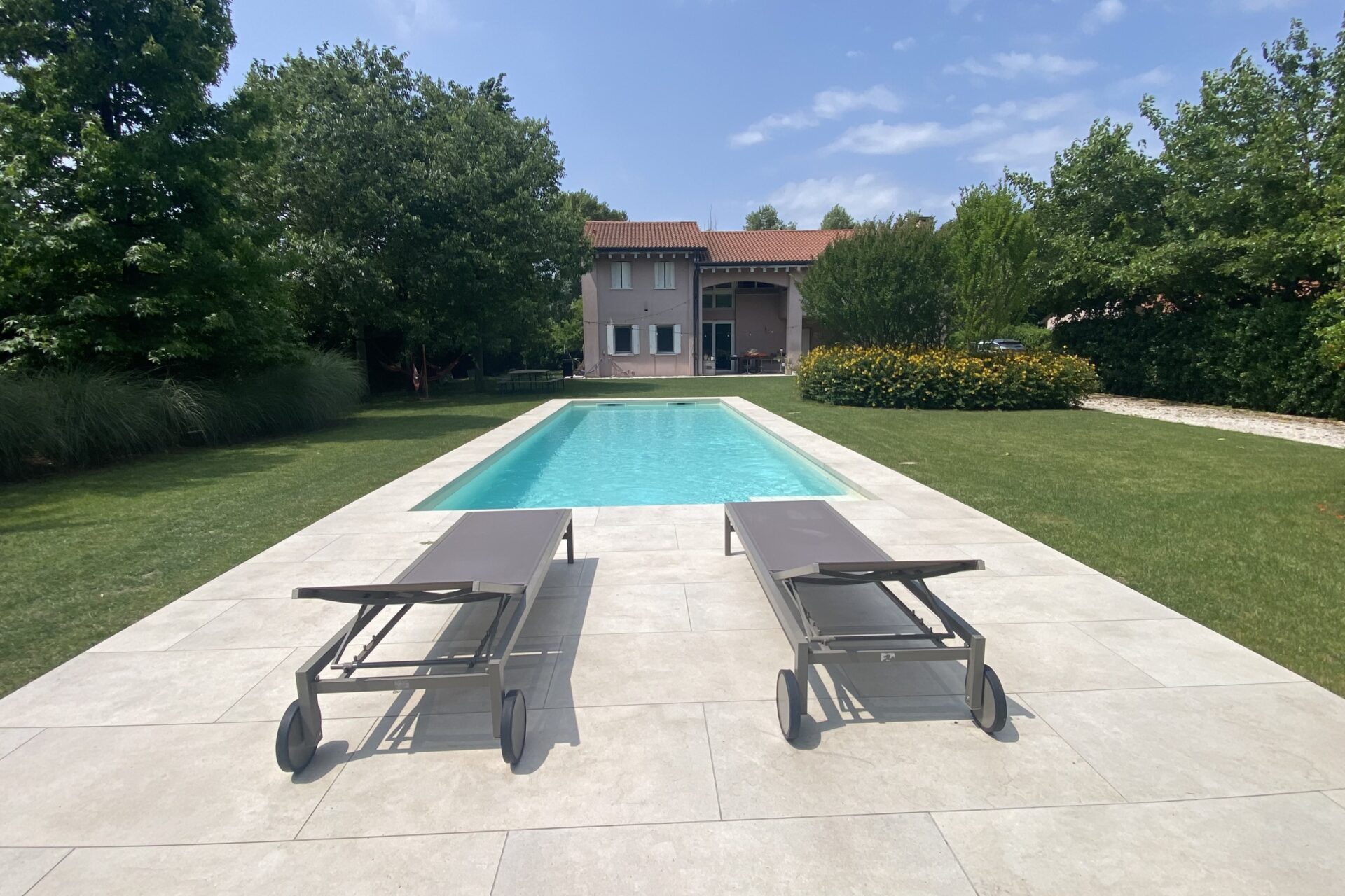 Il progetto ha ridefinito la percezione e il rapporto con l’esterno di un rustico immerso nella campagna veneta in cui l’inserimento di una piscina interrata e una ridistribuzione spaziale della viabilità e del verde hanno elevato il luogo da anonimo a luogo con un proprio carattere, nel rispetto del contesto. La piscina è stata volutamente posizionata al centro e leggermente rialzata sia per ragioni di dominio sul resto sia per ragioni pratiche di distanza dagli alberi esistenti e dai loro coni d’ombra. Dopo aver operato alcuni spostamenti di esemplari nel modo più funzionale al nuovo progetto è stata creato un fondale perimetrale di forma sinuosa in modo da non percepire la regolarità del lotto ed enfatizzare la sensazione “immersiva” nella natura. L’obbiettivo è stato quello di veicolare le viste proprio con l’utilizzo delle nuove masse arbustive, talvolta occultando talvolta aprendo, ottenendo un’ambientazione semplice e intuitiva in cui il concetto di armonia non dev’essere spiegato ma “sentito”. Particolare attenzione è stata messa nell’accostamento cromatico stagionale (fioriture, foliage, cortecce) e nell’utilizzo di arbusti con fogliame e texture in alternanza. Un approccio olistico è sempre garanzia di un benessere completo per i luoghi dell’abitare.